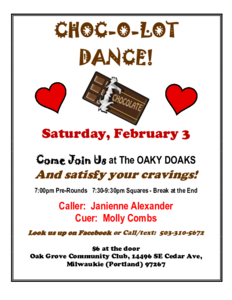 February 10th will see us celebrating chocolate and Oregon’s birthday at our Queen of Hearts Dance.