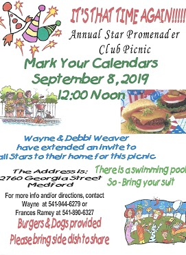 The Stars “Club Picnic” will be on September 8th. Wayne & Debbi Weaver have extended an invitation to all for the use of their home for this event. Thank you, Wayne & Debbi!