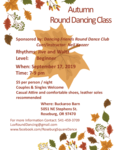 Our mainstream lessons will be on Thursday evenings, starting October 3, 7:30 - 9:00 p.m., through December 13. We’re once again offering lessons through Linn-Benton Community College, with Bruce Lowther as our wonderful instructor. We look forward to seeing you on the dance floor this fall! Karen