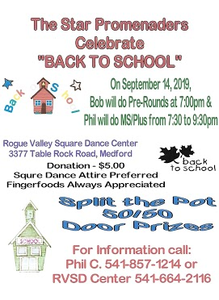 · Saturday, September 7th, Mainstream Dance with the theme of “Back to school”, Mike Stout and Ken calling and cueing.
