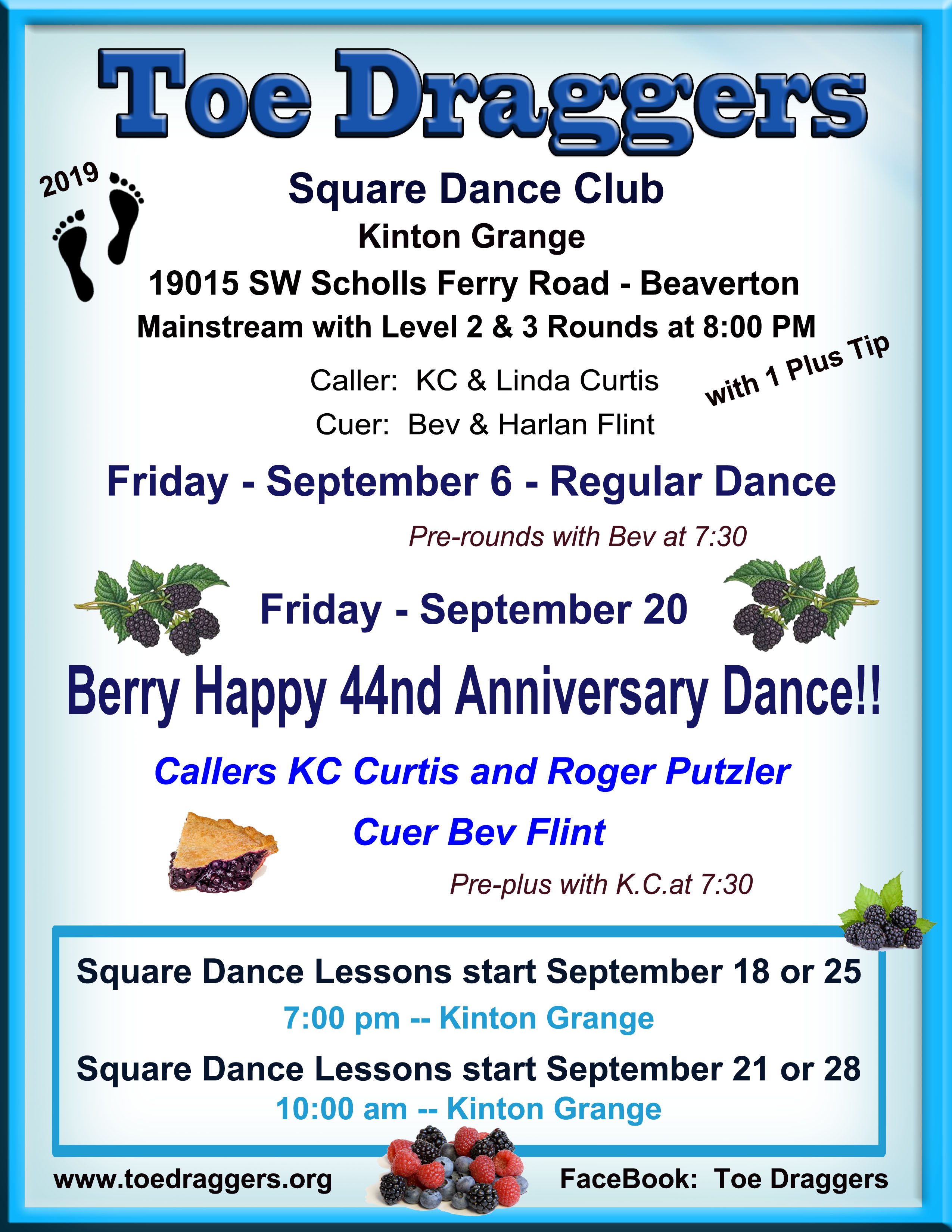 All are encouraged to attend Anniversary Dances to keep the spirit of Square Dancing alive and well. This month Wave Steppers celebrates September 14th, on the 21st Toe Draggers, and the Tri Squares on the 27th. They will appreciate your support.