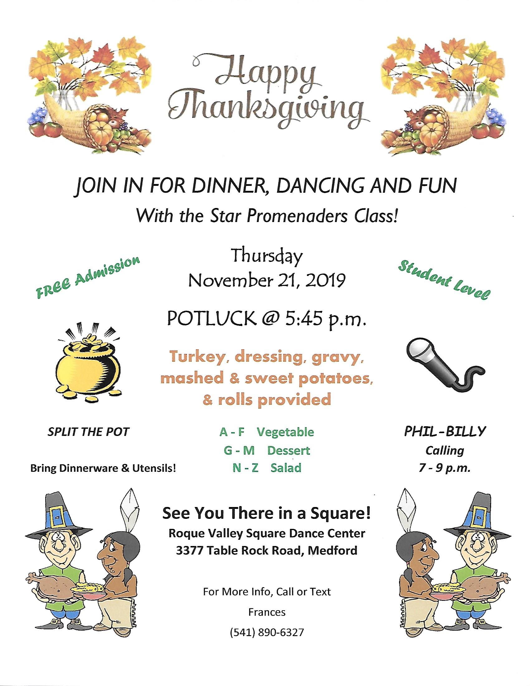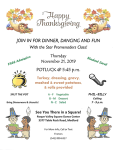 Then on November 21, put your appetite on and come join the Stars Class for a Thanksgiving Potluck. Check out the flyer to see the designations for what food to bring. Come on out and do like the rest of us, and eat too much. Then on November 23rd is the club Thanksgiving Dance.
