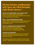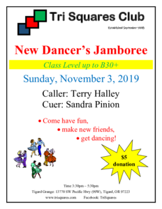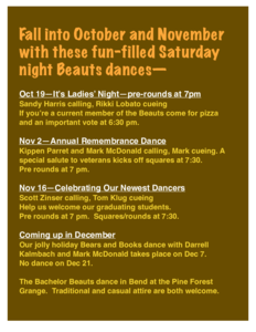 Upcoming on Sunday November 3rd we’re having a New Dancer Jamboree, at 3:30. And please remember, we’ve changed our dance nights to 2nd and 4th Fridays now, with a “Homecoming” dance on November 8th and “Grateful Harvest” on November 22nd.