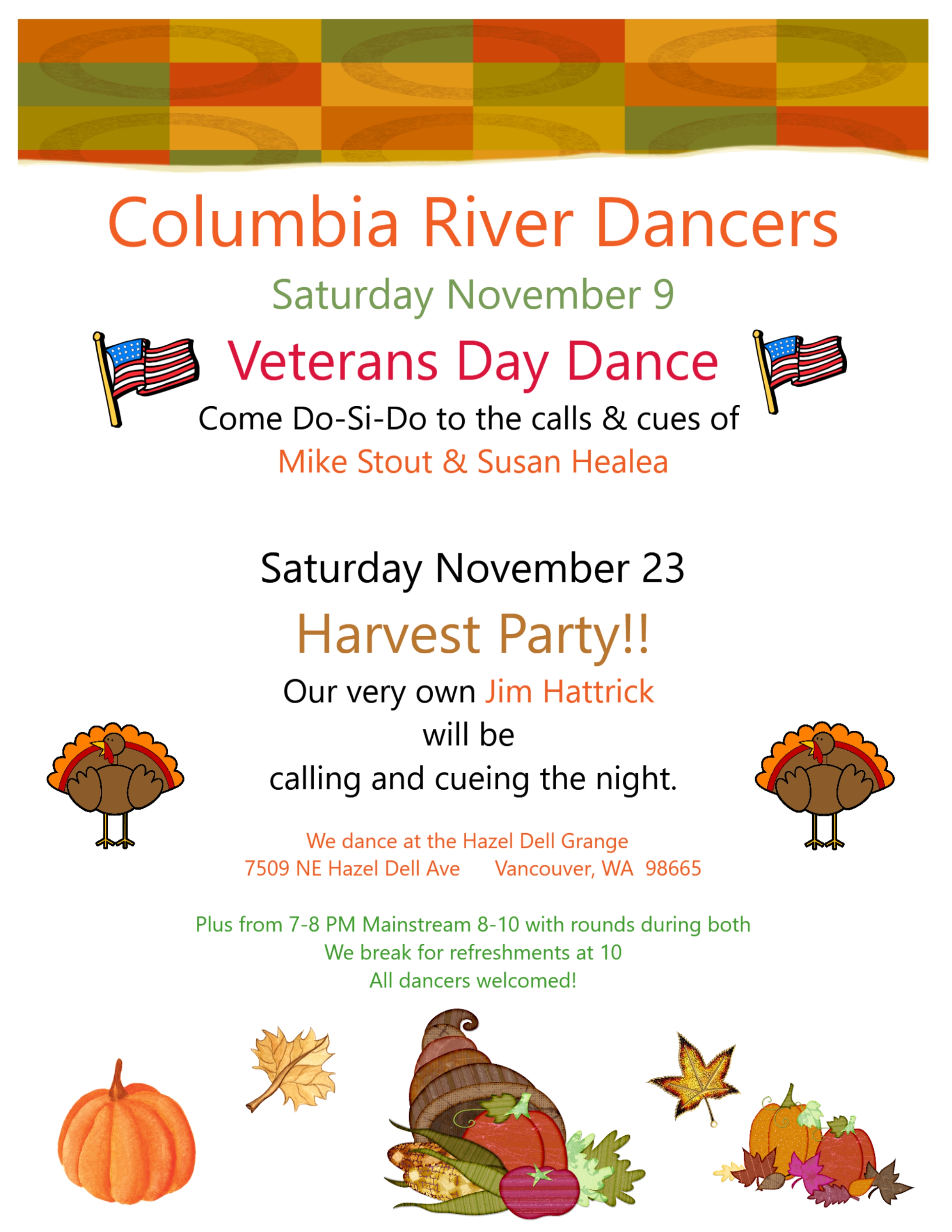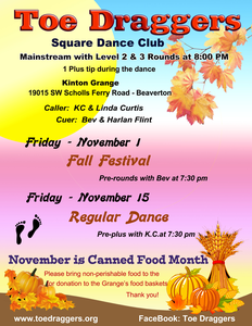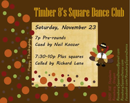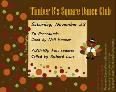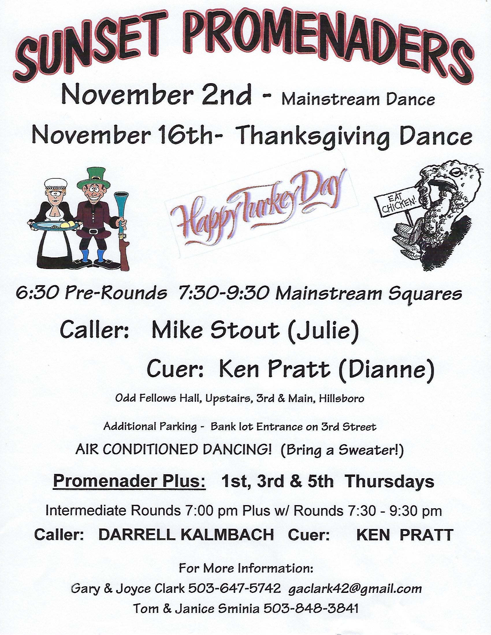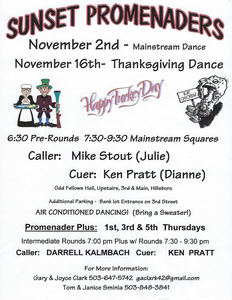 • Saturday, November 16th, Mike Stout calling and Ken cueing. Mainstream Dance with a theme of Thanksgiving.