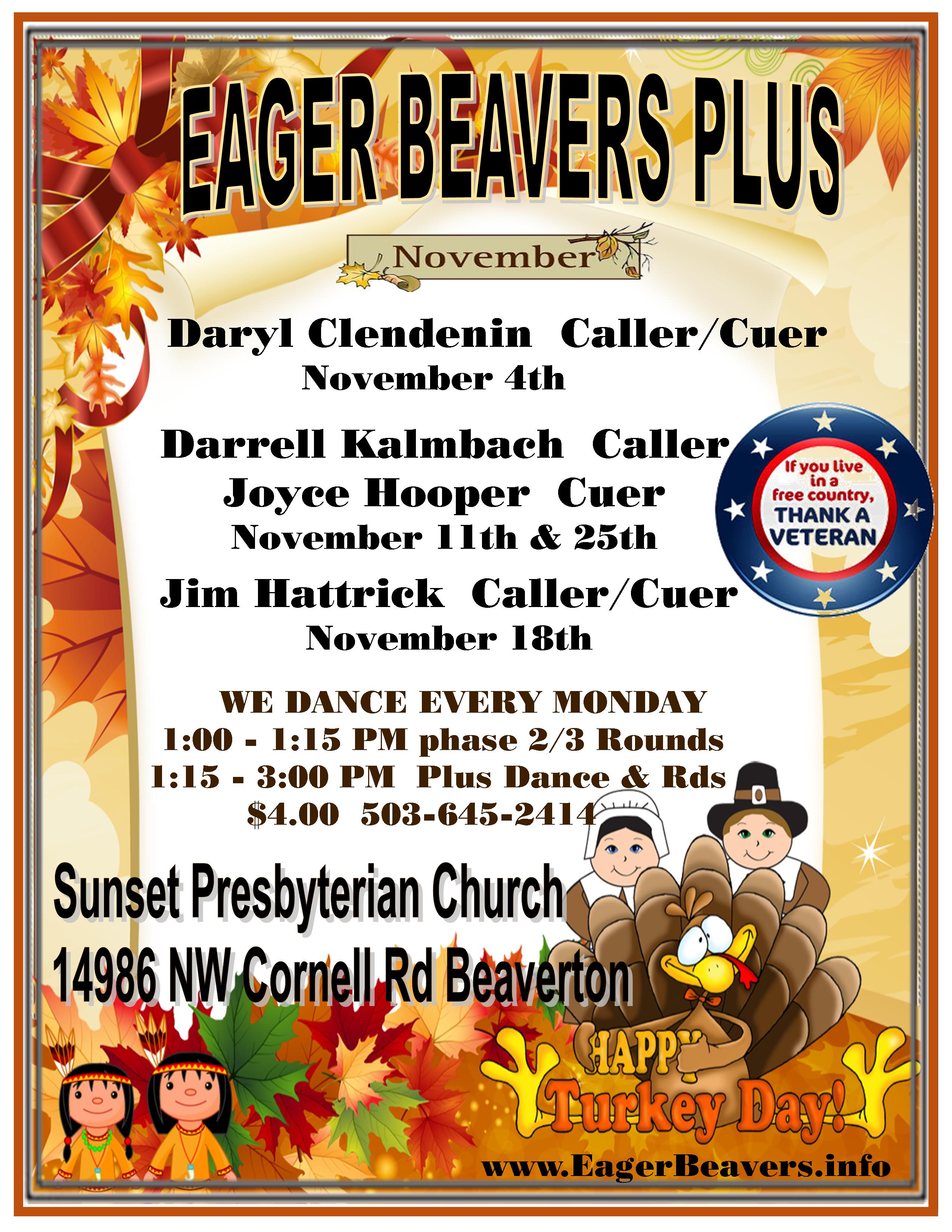 We dance on most holidays. Even if you have a job, you can join us once in a while. Our three callers keep us on our toes as each week one seems to have some new twist to keep our minds sharp. All plus dancers are invited to dance with us on Monday afternoons, 1:00 p.m. - 3:00, at the Sunset Presbyterian Church, 14986 NW Cornell Road in Beaverton. Please check for up to date information at www.EagerBeavers.info.