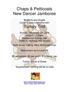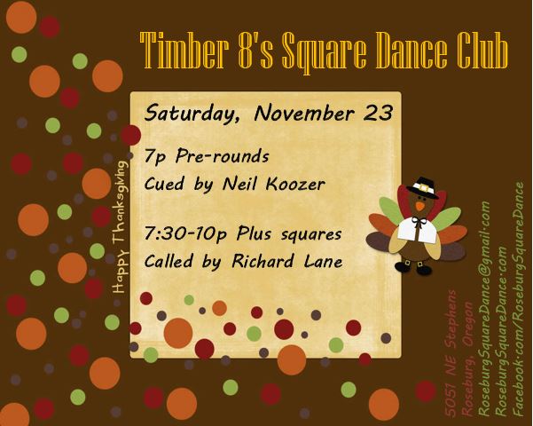 November 30 (5th Sat)As Thanksgiving is late this year our 4th Saturday Dance is before we eat that big turkey dinner so it we will not have our usual Turkey Burn-off dance but we plan to have a great time with our outstanding club caller, Jim Hattrick. We will have plus from 7-8 and mainstream from 8-?. It will be a good time to stop and relax before jumping again into the Christmas shopping. We look forward to seeing you in a square. Also, just to remind some clubs it might be a time to come get your banner back.