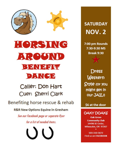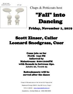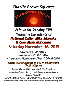 November will be full of fun dancing~~November 2nd is our annual treat of dancing to J Domis - as well as Bob Dingman. J is always a favorite of the dancers. If you've never danced to him, be sure and join us on Nov 2nd. 7pm Pre Rounds & MS & Plus 730-10pm. November 16th we will have National Caller Mike Sikorsky!!! He is a great caller - if you've never danced -please join us (and get a preview of Diamond Lake, when he is the featured Caller!!). Mark McDonald from Bend area will be doing rounds - so it promises to be a great event!!! Advanced starts at 530pm. Pre Rounds at 7pm and Alternating MS/Plus from 730-10pm. $12 for the evening if you dance Advanced; $10 if you don't dance Advanced. Don't miss either of these great dances in November!!