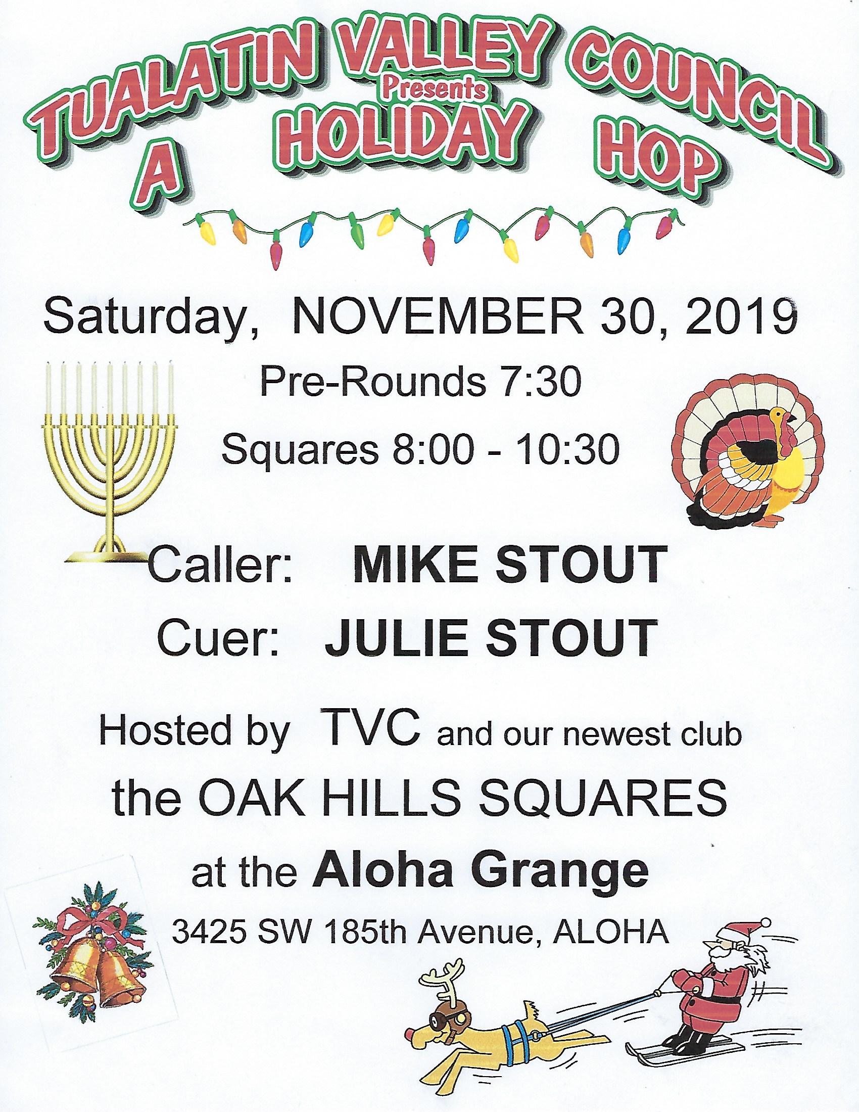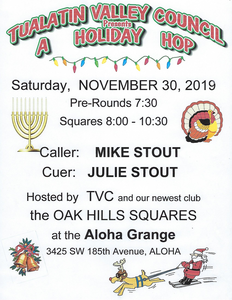 Our next Council event is a fifth Saturday Dance, held at the Aloha Grange on November 30th. This dance will feature Mike and Julie Stout calling and cueing. The dance begins with pre-rounds at 7:30 followed by Mainstream with rounds at 8:00. Every third tip will be Plus. This dance is co-hosted our brand new club to the TVC, the Oak Hills Squares.