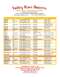 We have several special theme dances coming up. Please join us when you can. Sandy Harris call's the first Saturday and Lennie Ludiker on 4th Saturdays with Christina Corelli cueing both dances.