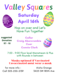 Our April dance is on the 16th with Craig calling and Connie Clark cueing. We are planning ahead for our 73rd Anniversary dance on May 21st. We are also planning visitations with our new members so they can get in more dancing, acquaint them with other Clubs and Callers and get to know the square dance community.
