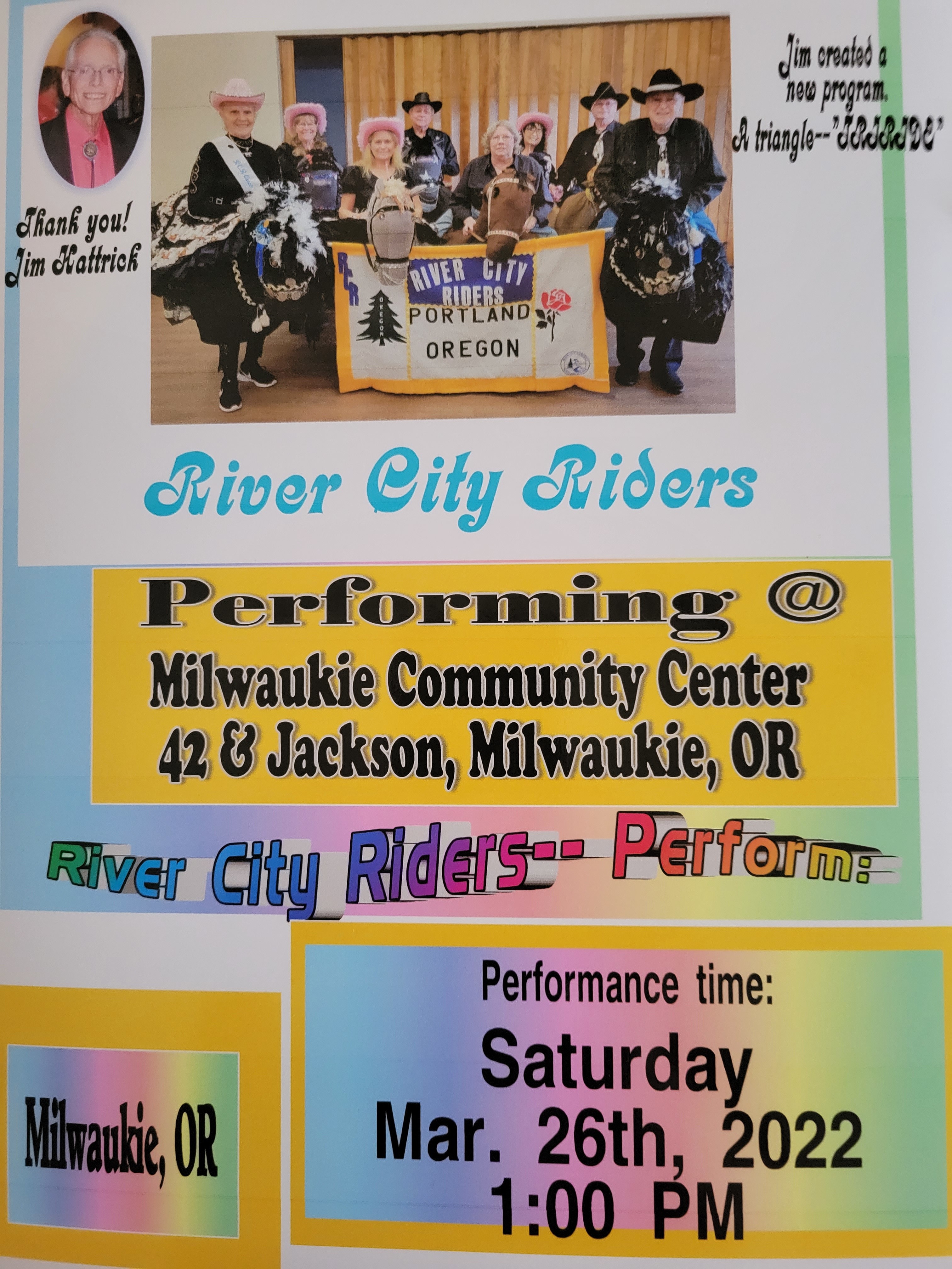 The River City Riders are having a special performance at 1 PM on Saturday, March 26, at the Milwaukie Community Center at 42nd and Jackson, to premiere their new Triangle program called "Triride", created by Jim Hattrick. Come see the fun, and help the Riders prepare for the 71st NSDC in Evansville, IN.