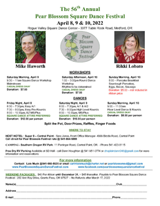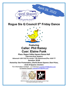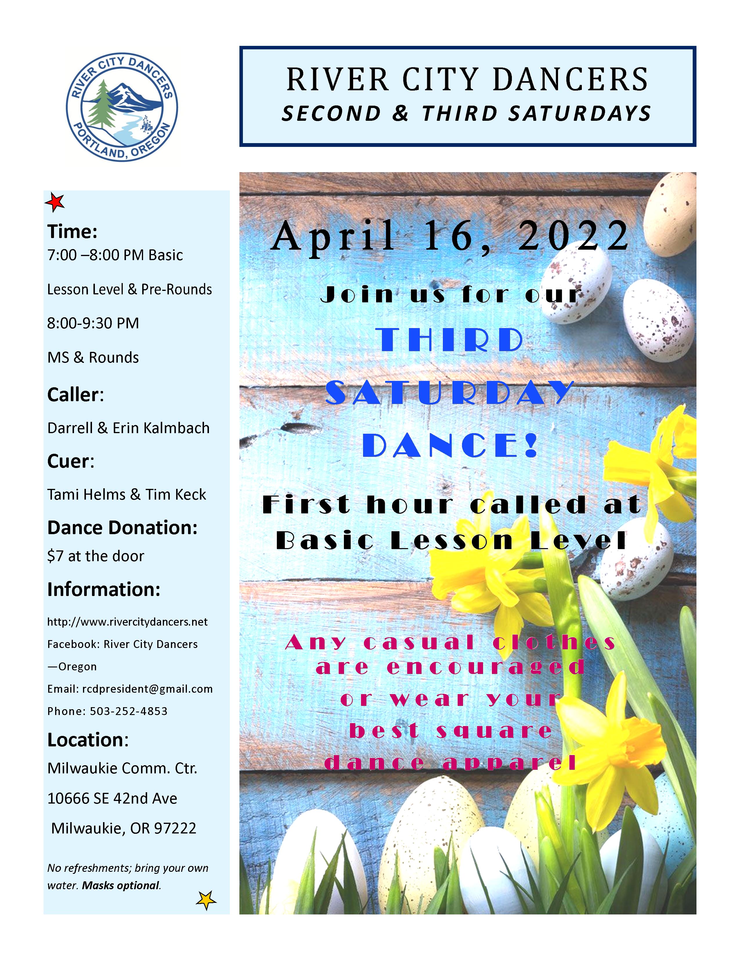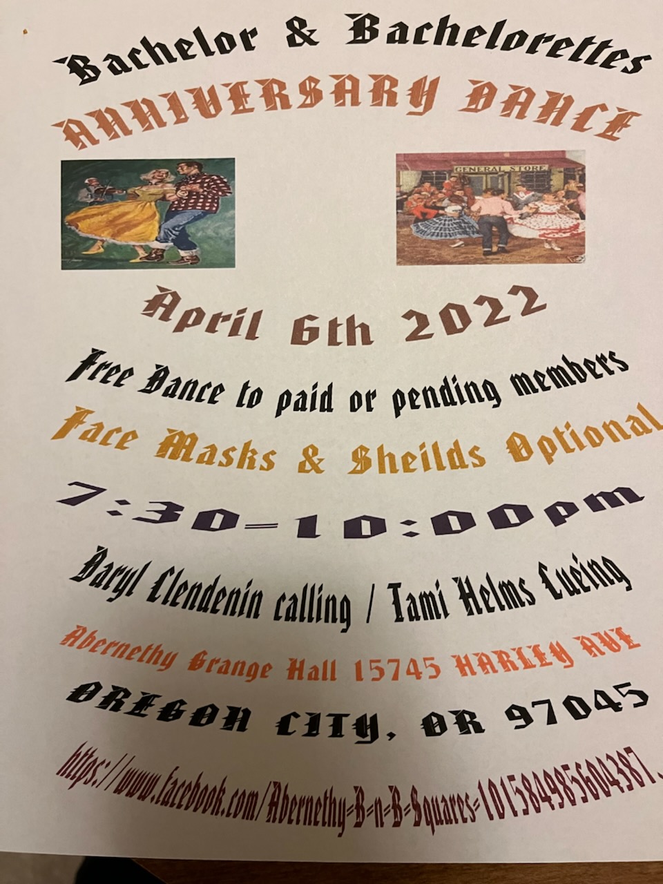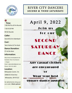 Our up coming dances are: Plus dance on April 8th at 7:30 pm for pre-rounds and 8:00 pm squares. Mainstream dance on April 22nd at 7:30 pm for Pre-Plus and 8:00 pm Mainstream. All dances are at the Newberg Chehalem Community Center with Randy Dibble as Caller and Leonard Snodgrass as Cuer.