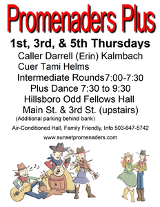 We previously announced that our mainstream class for lessons had been postponed to the 2nd Tuesday in March. That has again been postponed and will begin on the 2nd Tuesday of April. If anyone is interested in Plus or Advanced lessons/workshops, please contact us through our Facebook page: Valley River Dancers - Newberg, and let us know so that we can plan for those following our mainstream lessons. Mainstream lessons begin at 6:30 to 8 pm with either Plus or Advanced lessons to follow at 8:00 to 9:30 pm. They will be held at the Newberg Chehalem Community Center and taught by Randy Dibble.
