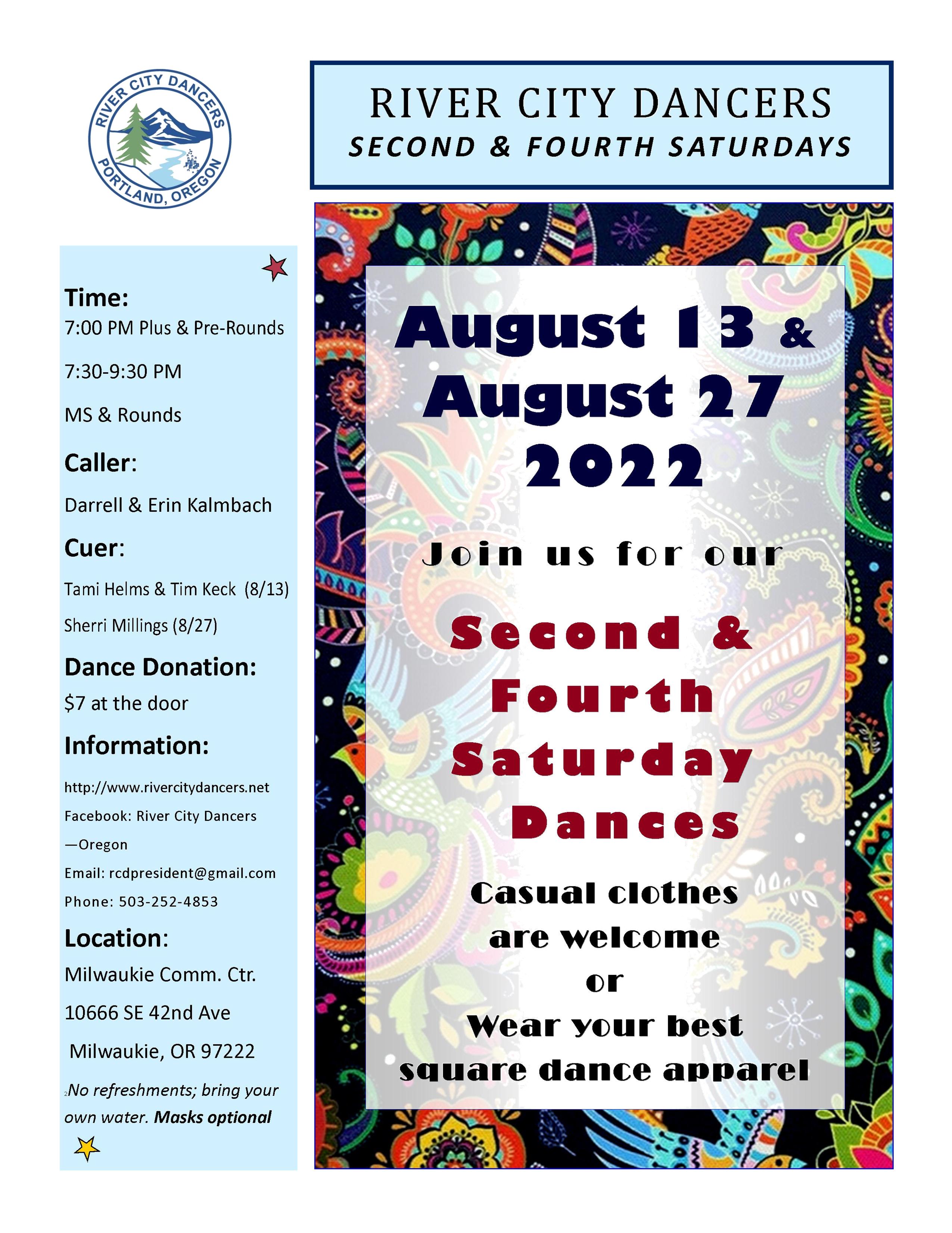 August brings the end of summer vacation, but in Oregon it usually means two more months of summer weather. Seems hard to believe that in a little over a month my term as President of the OFSRDC will come to an end. Been an interesting year as we have seen some clubs start dancing again, some decide to hold off and, at least two clubs have decided to fold. That is sad, but not unexpected given the difficulties negotiating this COVID virus. But, the good news is that a new club is starting up over in Central Oregon. Maybe that will signal a re-birth of this activity.