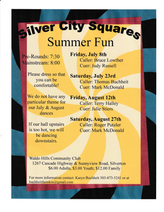 As of this submission we have not yet had our “Dance Under the Stars” special dance, July 22nd. On stage will be Darrell Kalmbach calling Mainstream with a half hour of Pre-Plus beginning at 7:30 p.m., and Leonard Snodgrass cueing a mix of rounds. Instead of dancing at the tennis courts we will be squaring up at the Newberg Les Schwab parking lot, 110 Sitka Avenue.