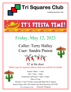 Mainstream dances will be held on May 6th and May 20th with Darrell Kalmbach calling and Tami Helms cueing. The May 6th dance will have a special theme of Cinco de Mayo. We are so happy to have Darrell and Tami as our regular caller and cuer! The first and third Thursdays are our Plus dances (May 4 & 18) with Darrell Kalmbach calling and Tami Helms cueing.