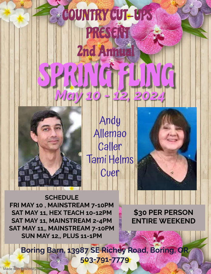 Valley Squares dances for May are the first Friday, May 3rd with Mark Wheeler calling and Connie Clark cueing. Our third Saturday dance is May 18th, and NO we are not celebrating the anniversary of the Mt. St. Helens eruption. But, come to think of it that might be a fun theme. Our caller is Mark Wheeler, cuer Connie Clark.