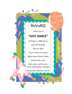 In May we have new officers (but as I write this in April, we don't know who they are yet!) On May 10th we'll have our "Fiesta Time!" dance, in honor of El Cinco de Mayo. And on the 24th "Hippie Hoedown" where you can wear that old tie-dye shirt, John Lennon glasses, and flowers in your hair! Both dances will be called by Terry Halley and cued by Sandra Pinion, at 7:00 for Plus and Pre Rounds and 7:30 for Mainstream, Rounds, and 3rd tip Plus, at our grange in Kinton. We'll try again for a visitation to Valley Squares on May 3rd.