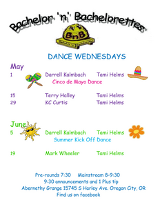 R Square D’s Wednesday night lessons will finish on May 8th and we will have a “finish the year” dance on Wednesday, May 29th. This will be a great dance for those who have just finished lessons or are fairly new dancers. It will be held from 6:30 to 9:00pm at the Kelso Senior Center.