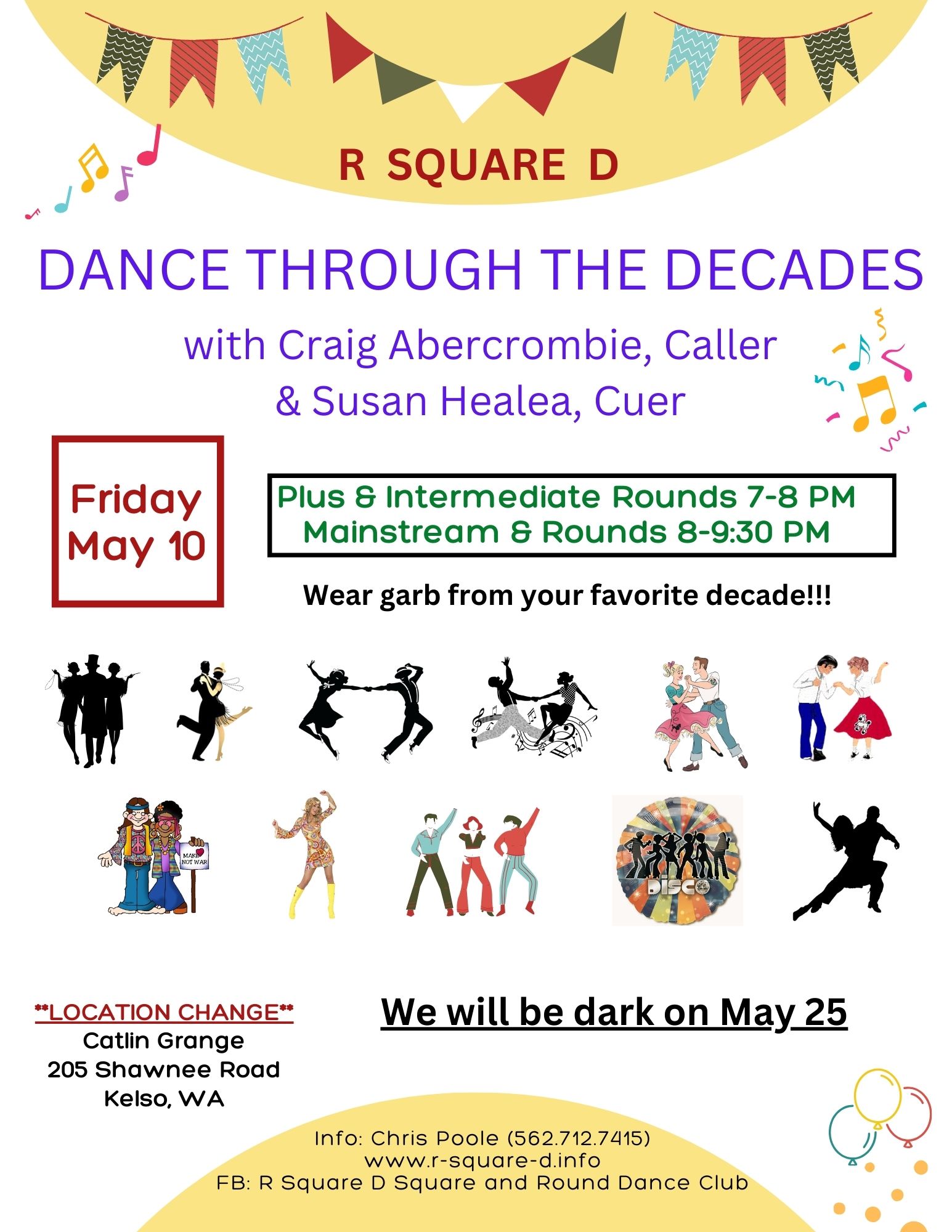 Friday, May 10th is our “Dancing Through the Decades” dance with Craig Abercrombie calling and Susan Healea cueing. This will be a fun night of music from various decades. Ladies and gentlemen, put on your poodle skirts, Roaring 20s garb, Zoot suits, hippie-era outfits or whatever you feel comfortable dancing in! This is our only dance in May, because we will be dark on May 25th for Memorial Day weekend.