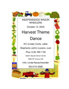 Valley Squares Friday, October 4th dance is "Fall Harvest", 7 pm to 9 pm with Mark Wheeler calling and Connie Clark cueing, refreshments after the dance downstairs. Our Saturday, October 19th dance is "Spooky Dance", 7 pm to 9 pm, wear your spooky outfit (if you want), Scott Zinser calling and Connie Clark cueing, refreshments after the dance downstairs.