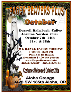 Since there are five Thursdays in October there will be Plus dances on October 3rd, 17th, and 31st! Darrell Kalmbach is calling, and Tami Helms is cuing. Costumes are encouraged on the 31st. Happy Halloween!