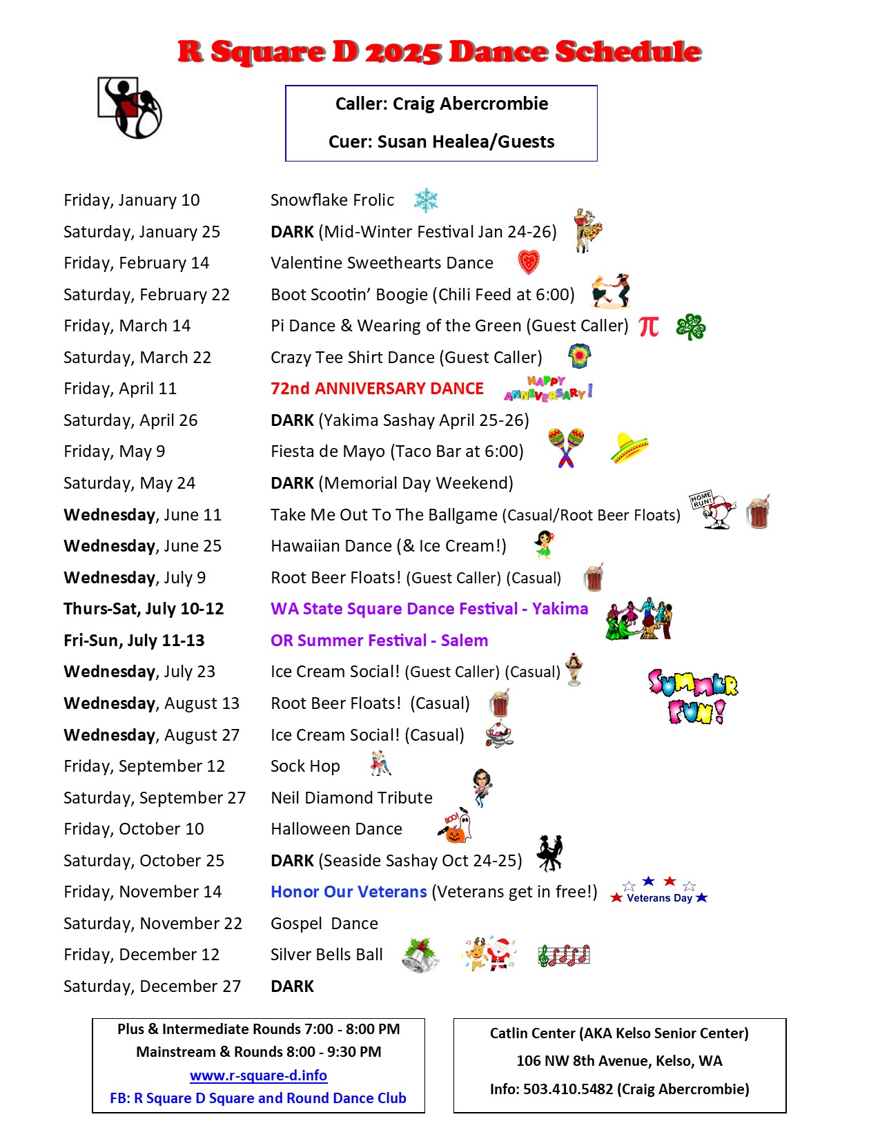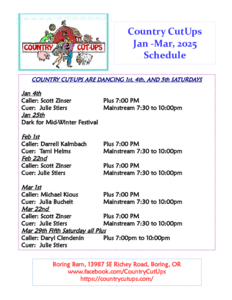 Happy New Year everyone! Our first dance for the new year of 2025 will be “Bring in the New Year", on Friday, January 3rd, 7 p.m. to 9 p.m. with Mark Wheeler calling and Connie Clark cueing, at the Aloha Grange. Our Saturday dance, January 18th, 7 p.m. to 9 p.m., will have Scott Zinser calling and Connie Clark cueing. Come join us, it's always fun.