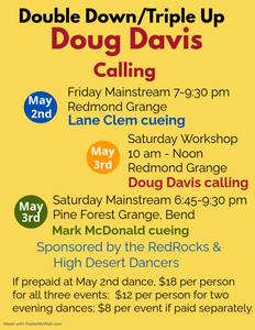 May will start with a Cinco de Mayo Dance on the 5th featuring Darrell Kalmbach calling Plus with Tami Helms cueing, then with lots of great dancing in between, ending with our Memorial Day Dance on the 26th, featuring guest caller Daryl Clendenin and Lane Clem cueing Phase II and III Rounds.