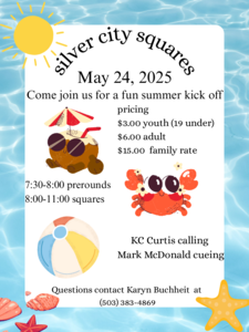 The Hayshakers square dance with Mark Wheeler calling every Sunday at 5 o’clock in the Pacific Grange on Hwy 101 halfway between Seaside and Astoria. It’s easy dancing which everyone can enjoy.