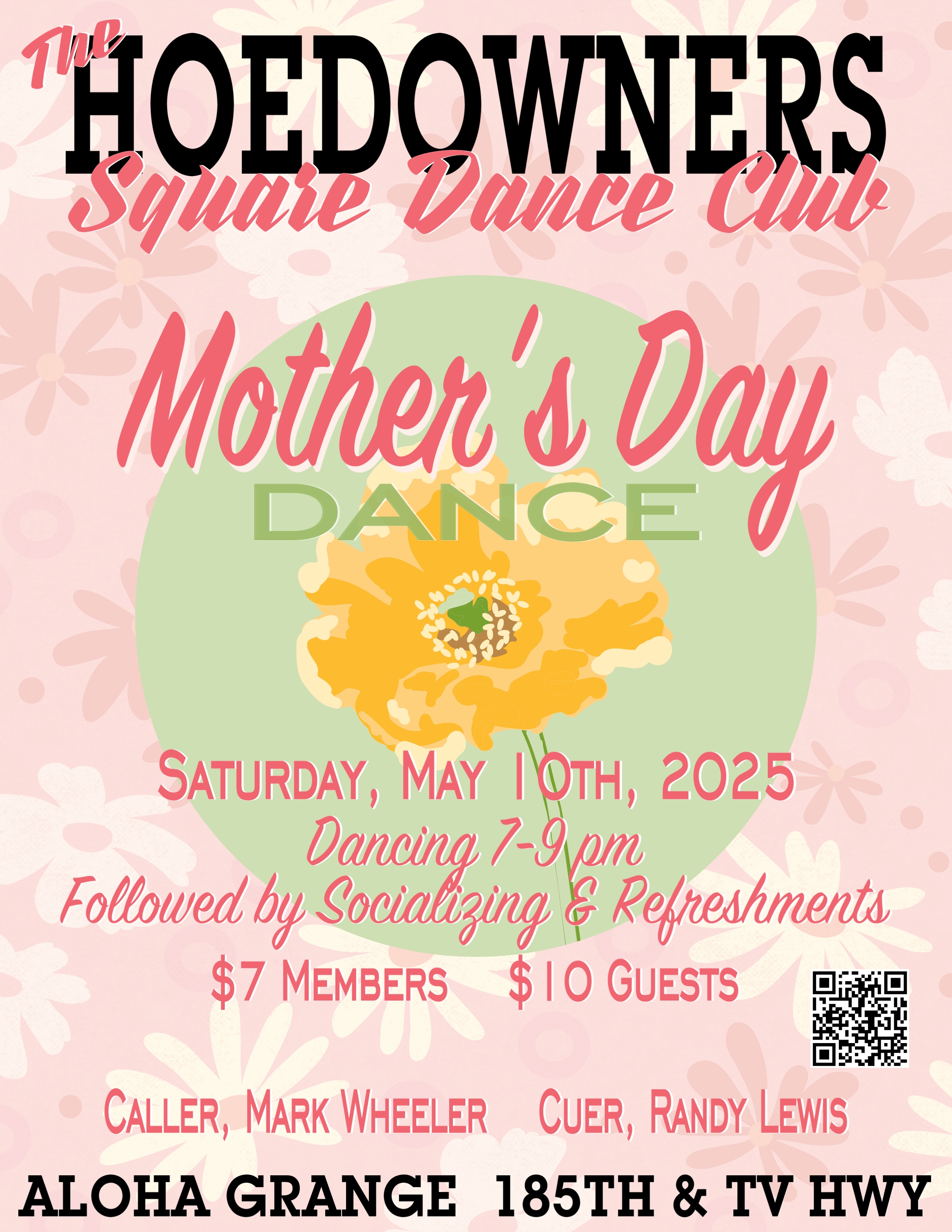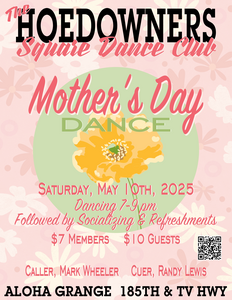 What does the future hold? A very busy May with our Mother’s Day Dance on May 10th and Memorial Day dance on the 24th. Hope you can come over to the Aloha Grange and join in.
