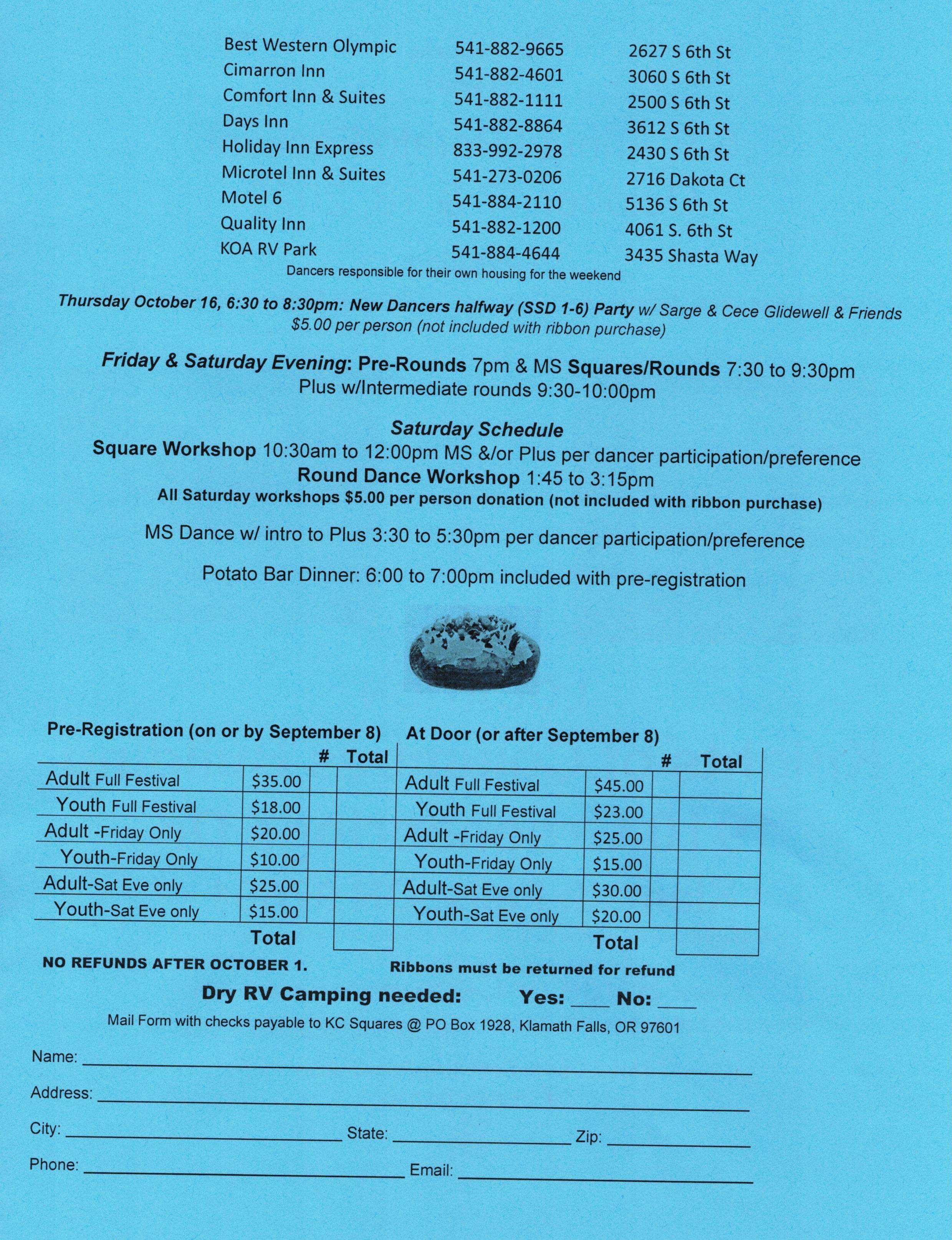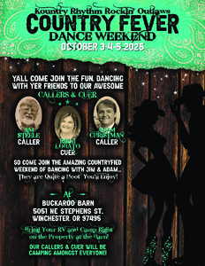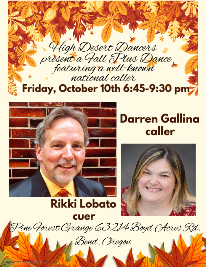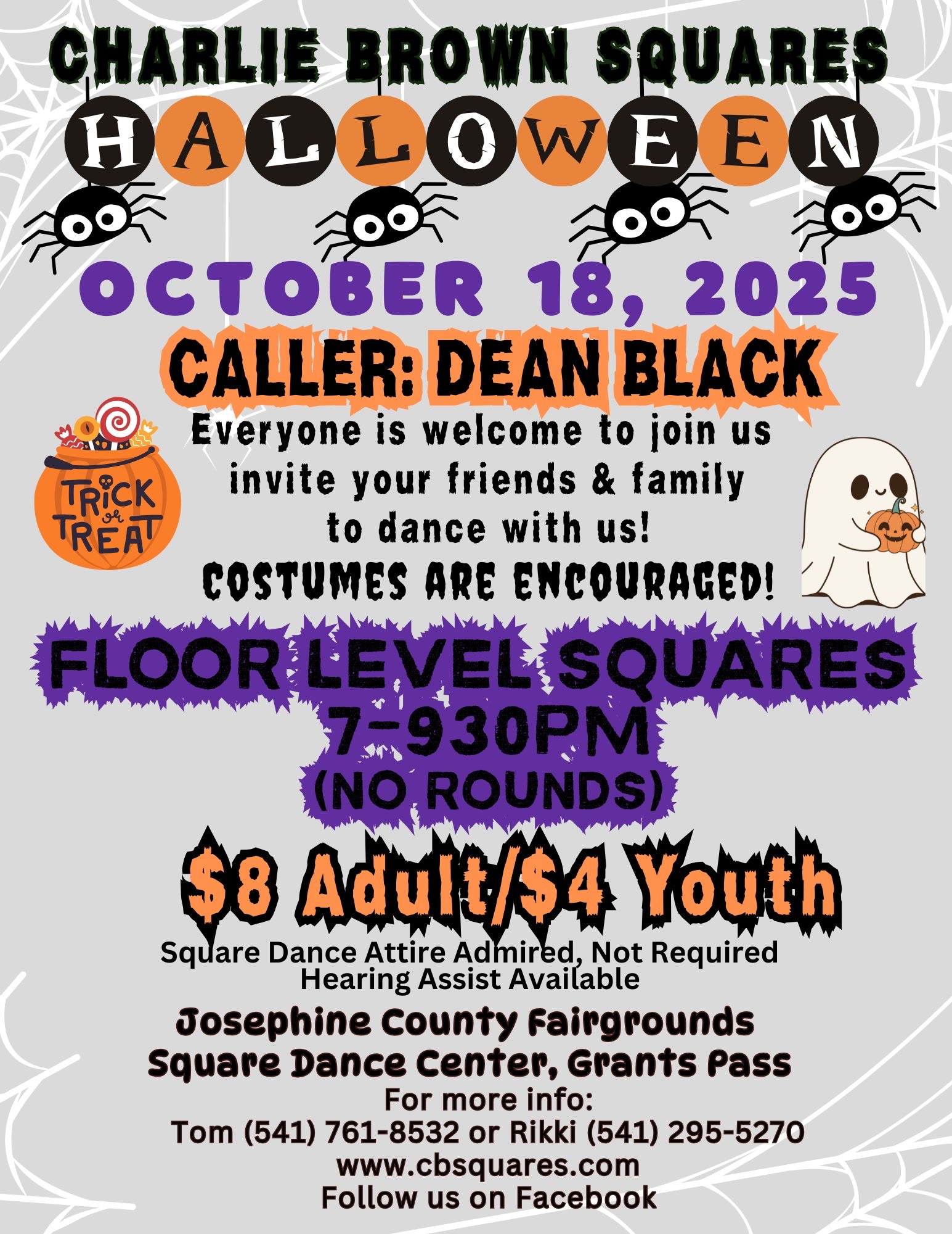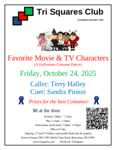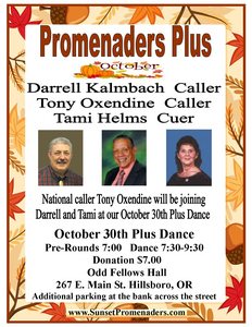 • Other dances in October include Plus dances on the 2nd, 16th, and the 30th. The dance on the 30th is a special event with national caller Tony Oxendine calling with Darrell Kalmbach and Tami Helms Cueing. All the Club’s door donations are $7 per person..