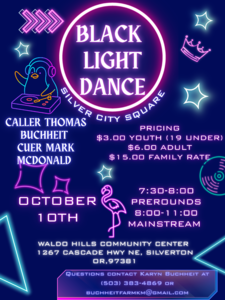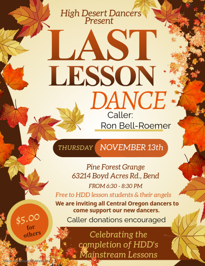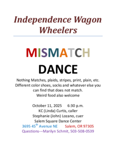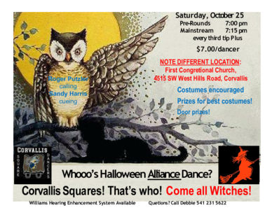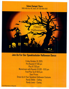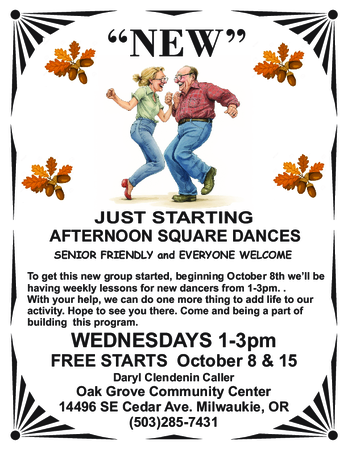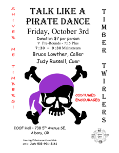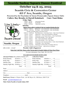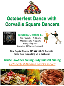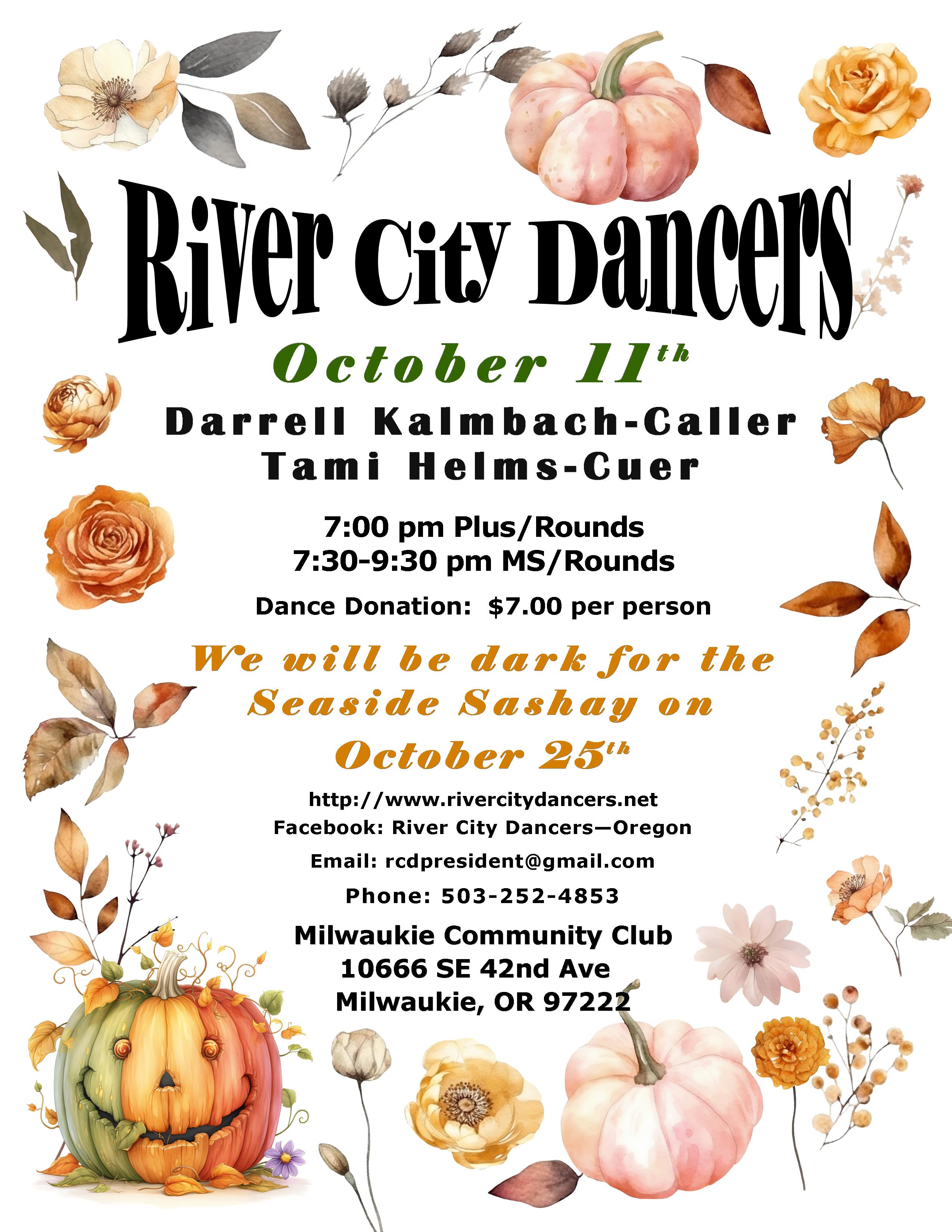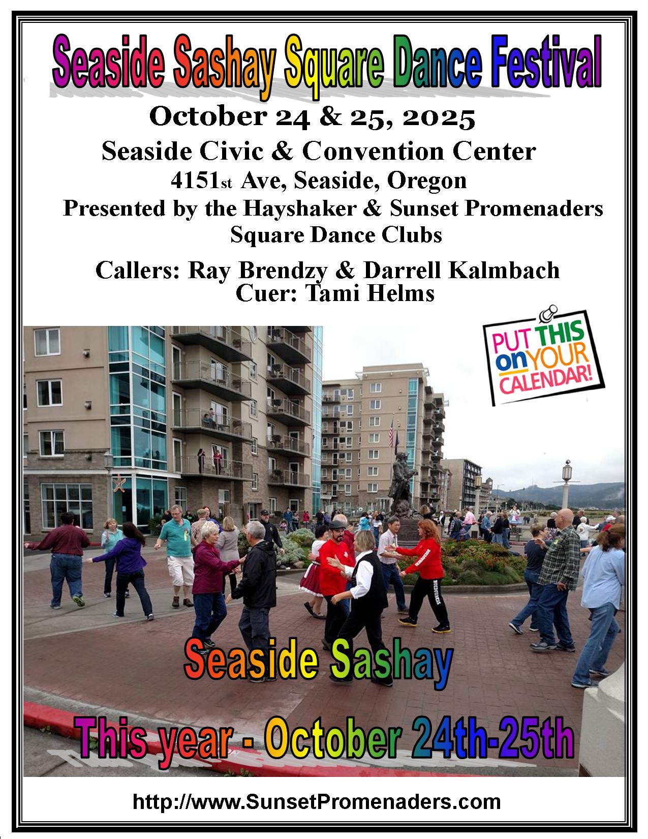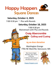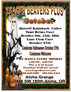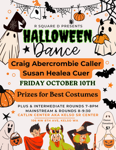 October our lessons will be in full swing. We have one dance in October on the 10th. It is our Halloween dance with Craig Abercrombie calling, and Susan Healea cueing. We are dark for our second dance October 25th. We are planning on attending the Seaside Sashay in Seaside, Oregon