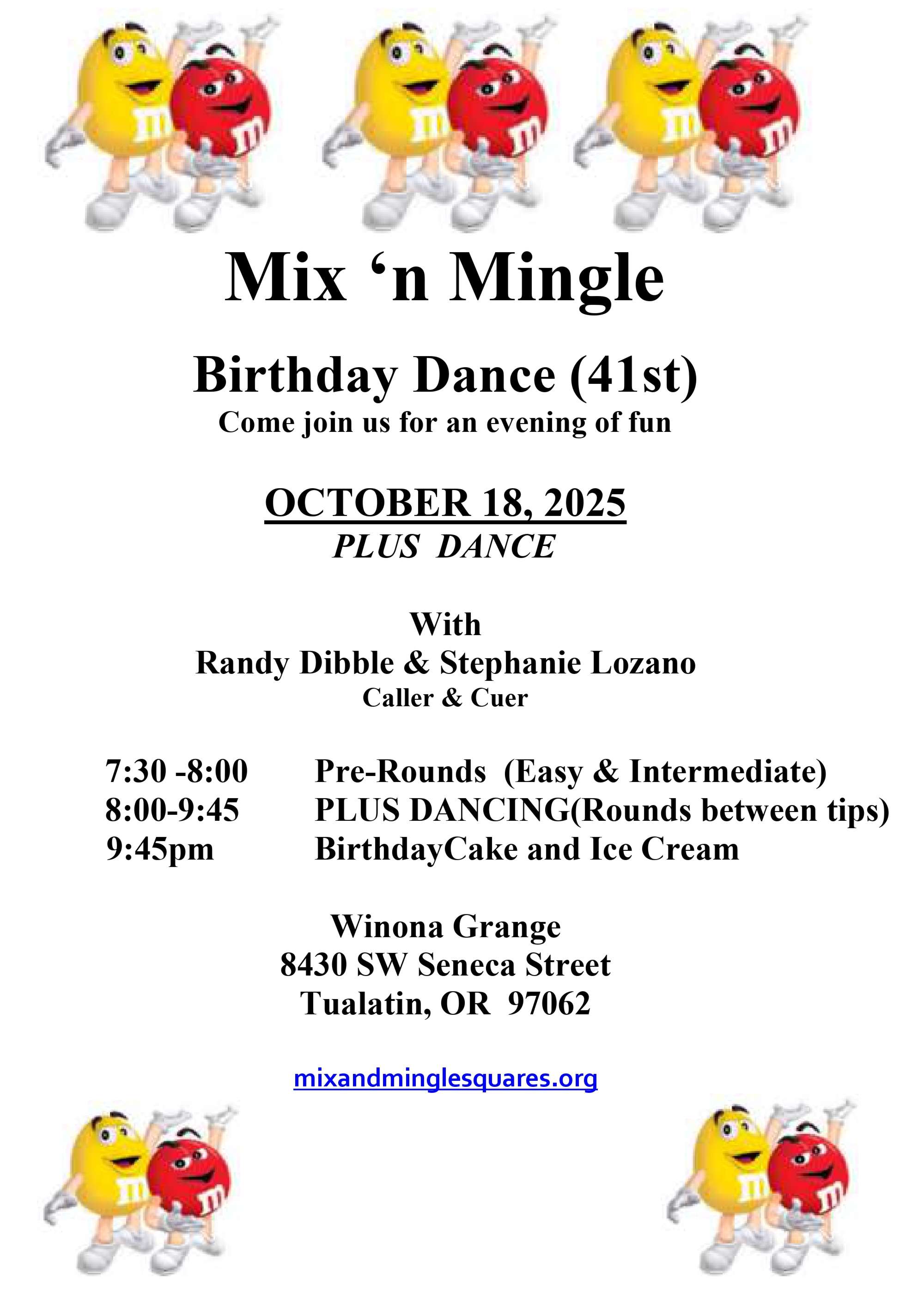 As October rolls in we remember 1984 - - the year the M&M’s came to be with the start up membership of 80 single dancers and one married couple! Thanks to all the dancers, callers and cuers who have come through our doors and supported us throughout our 41 year history. Be sure to check our website for details on our upcoming birthday dance this month with Randy Dibble calling and Stephanie Kroft cueing our 41st Plus level birthday dance on October 18th.