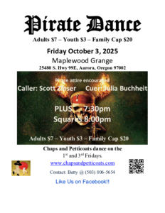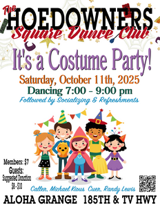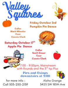 Valley Squares: Friday, October 3rd dance theme is "It's A Pie Dance", we will be serving pumpkin pie after the dance. The Saturday, October 18th theme is "It's Apple Pie Time", we will be serving apple pie after the dance. Both dances are from 7 pm to 9 pm at the Aloha Grange.
