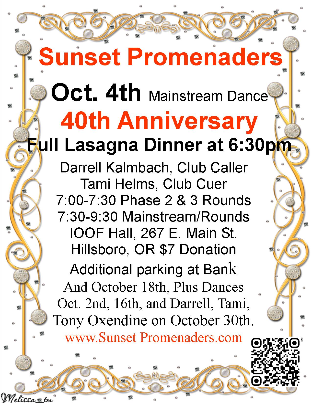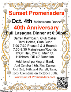 • October fourth is the Sunset Promenaders 40th Anniversary. To celebrate the club is having a full Lasagna Dinner at 6:30 PM. Darrell and Tami will be the Caller and Cuer for a Mainstream dance following the meal. We are hoping and are planning to have a lot of dancers for the meal and dance to help us celebrate our anniversary. There are many memories over the 40 years. For you that do not know, we dance at the Hillsboro Odd Fellows Hall, 267 E. Main St. Hillsboro, Oregon. There is extra parking across the street at the bank.
